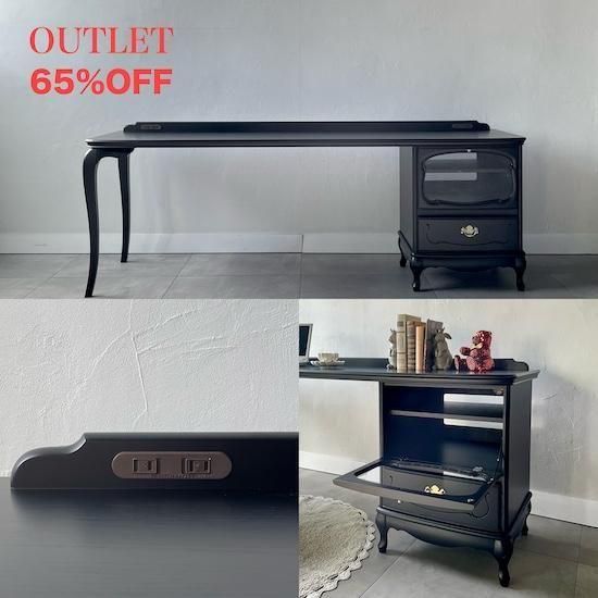 美しい曲線の脚とチェストを組み合わせたワイドデスク。 広い天板は作業がしやすく機能的でありながら、華奢な脚のラインが全体を重く見せない絶妙なバランスのデスクです。 カラーはブラック。椅子は付いておりません。 チェストと脚は、お部屋に合わせて左右お好みの方に取り付けが可能です。 チェストの扉内は背板に穴が空いていますので配線などの処理も可能な仕様です。 両サイドに2口コンセント。アンティーク調でありながら使い勝手も重視しています。